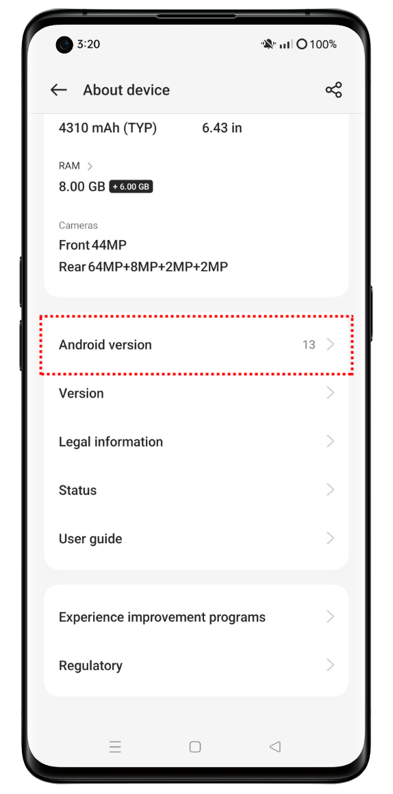 On your OPPO phone, go to [Settings] > [About Phone] / [About Device], and tap [Android version] to view your device's Android version information.