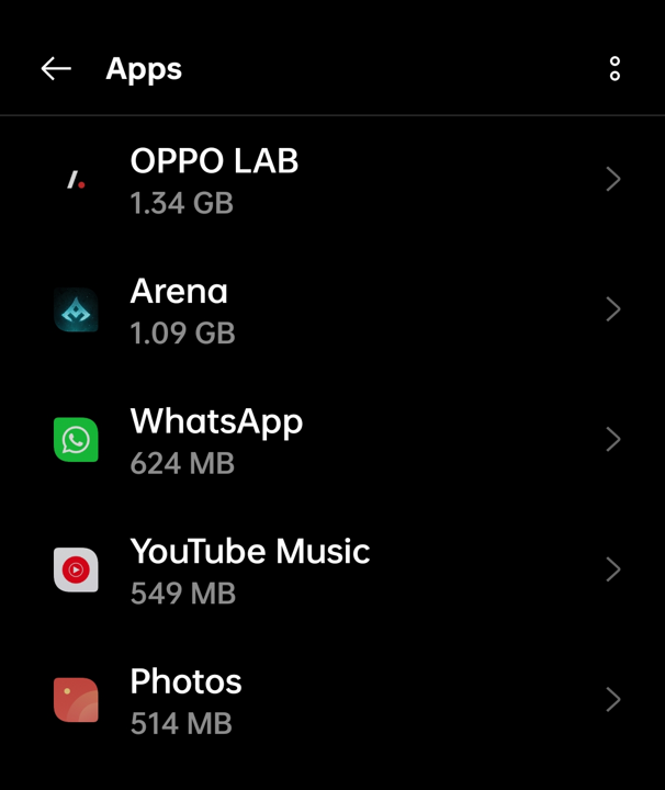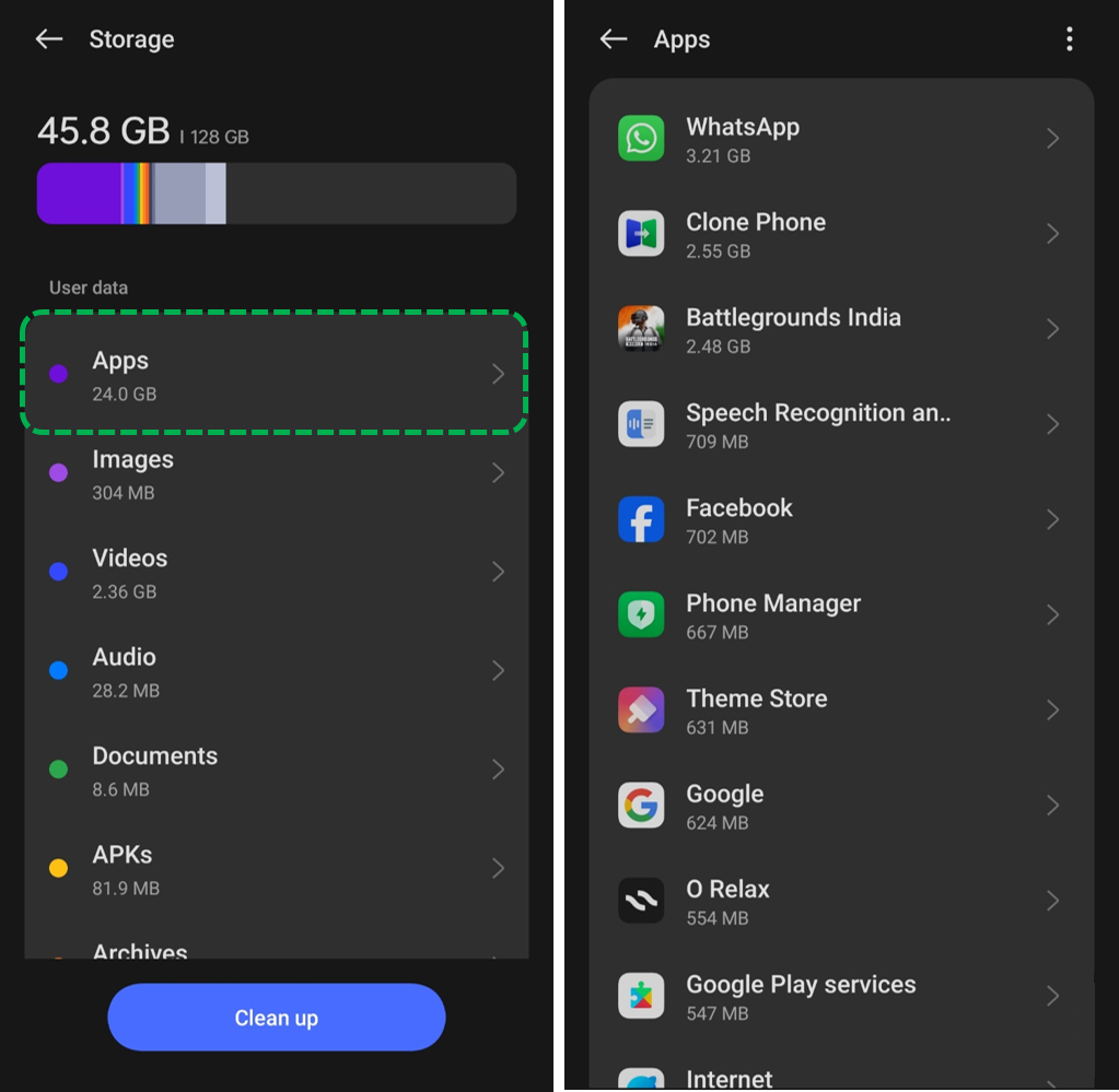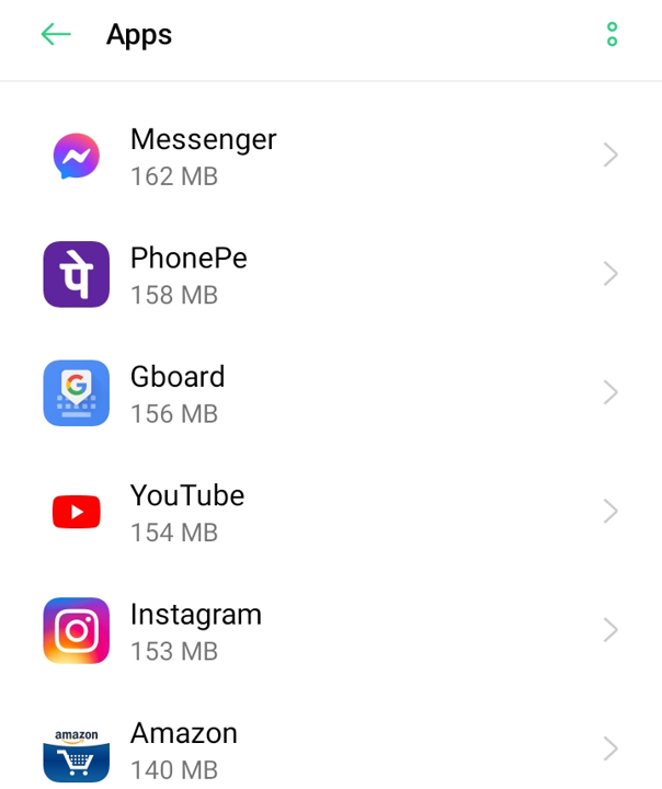 After tapping the [Apps] option, you will get the list of applications along with the space consumed by them. You can select those applications to clear the data, cache, or uninstall.