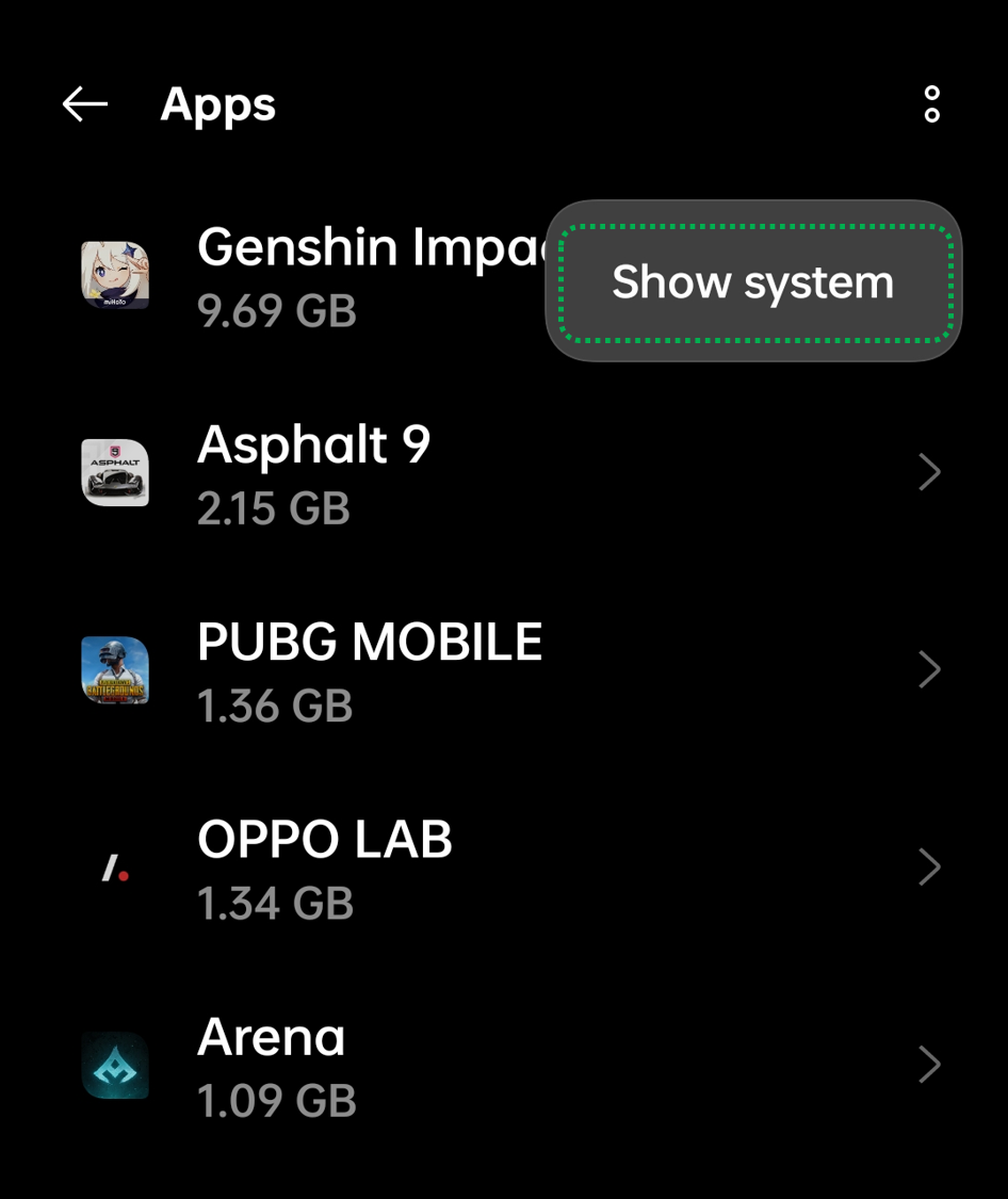 To check the space consumed by system apps, simply go to [Storage] > [Apps] > [] > [Show System].