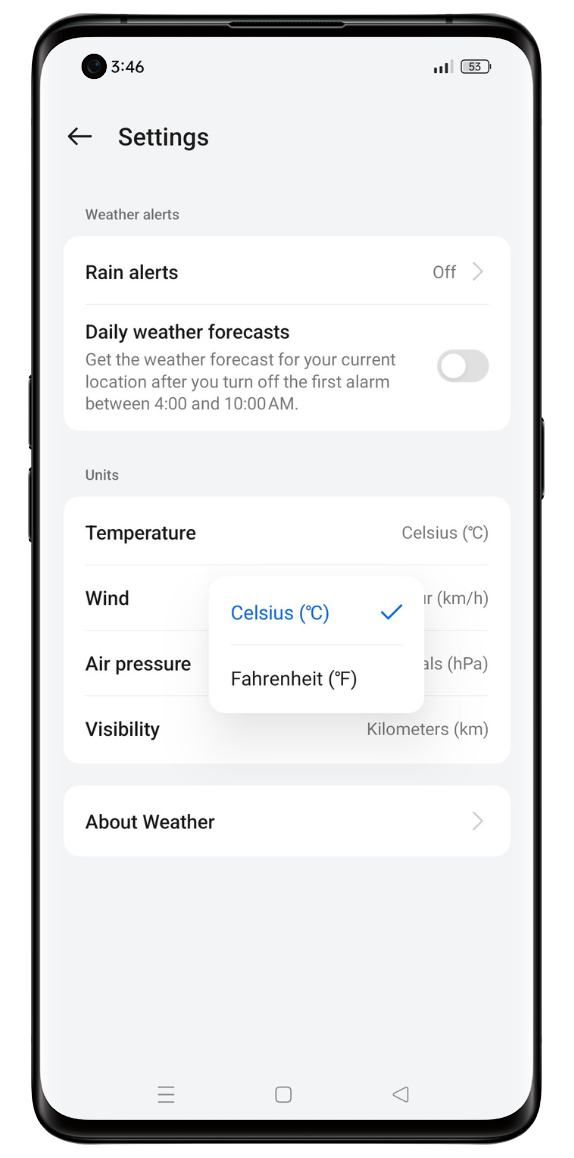 Choose Fahrenheit or Celsius. On the main screen of the Weather app, tap [Settings] in the upper-right corner > [Temperature].