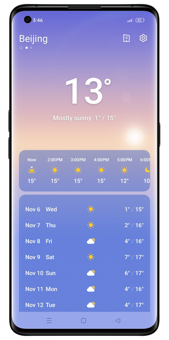 Stay updated with the latest weather updates using the built-in OPPO Weather application. The weather app is designed to be stylish yet user-friendly and features a clean layout with minimal icons, making it easy to grasp weather updates at a glance. It also includes a dynamic background display that changes according to the current weather conditions. (Available for ColorOS 6.0 and later).