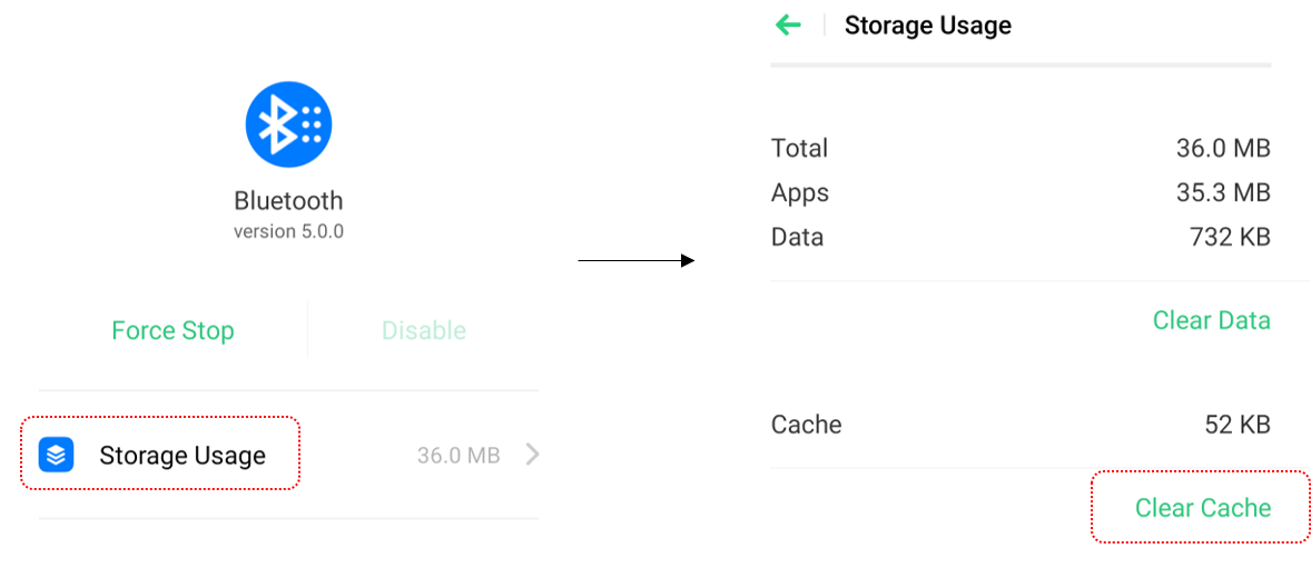 ā For ColorOS 5.0- 6.1: Go to [Settings] > [App Management] > [Show System Process] > [Bluetooth/ Bluetooth Share] > [Storage usage] > [Clear Data].