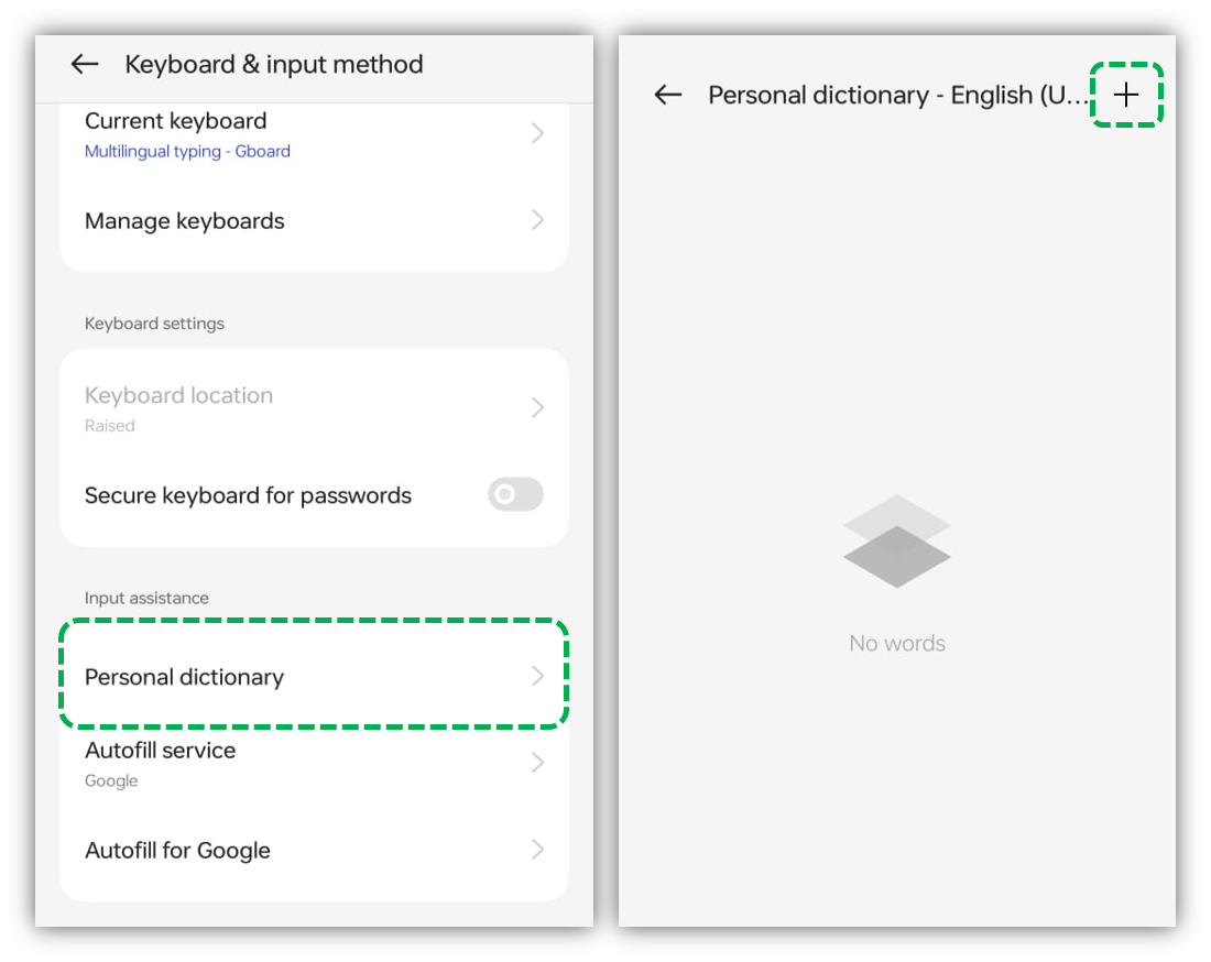 2. [Personal dictionary] > [For all languages] > Tap on [+] icon on upper right corner