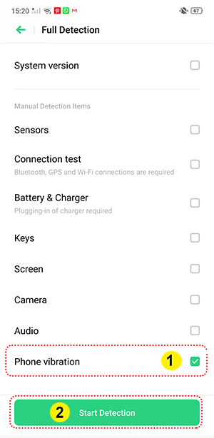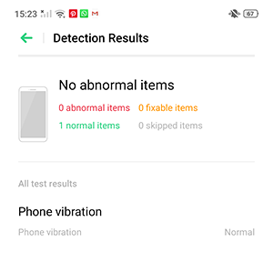 Follow the on-screen instructions to check if your phone vibration works properly. If the phone vibrates, tap [Vibration detected]. If not, tap [No vibration detected]. If detection results show abnormal, contact OPPO Support Team for assistance.
