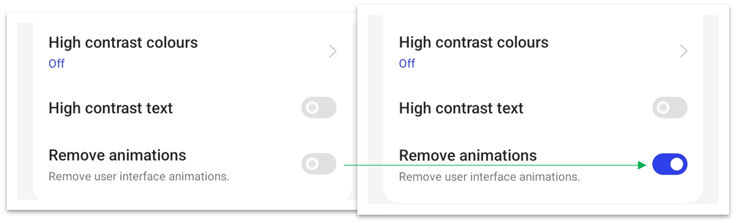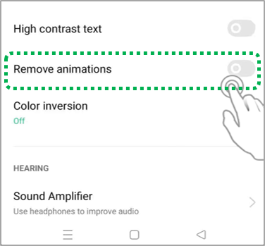 Go to [Settings] > [Additional Settings] > [Accessibility] > Click on [Vision]> Enable [Remove Animations].