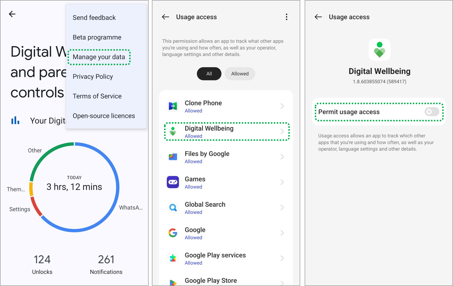 Go to: [Settings] > Open [Digital Wellbeing and parental control] > Select [3 dots] > Select [ Manage Your Data] > Select [Digital Wellbeing app] > Turn off [Permit usage access].