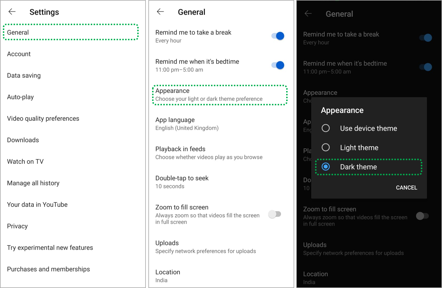 Open [YouTube] > Tap [Google profile picture] > Tap [Settings] > [General] > [Appearance] > Enable/ Disable [Dark Theme].