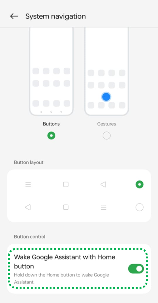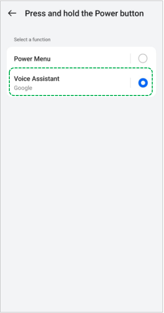 Go to [Settings] > Click on [System settings] > Click on [Power Button] > Tap on [Press and hold the Power button] > Select [Voice Assistant]