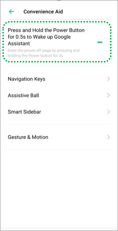 Go to [Settings] > Click on [Convenience Tools] > toggle [Press & Hold the Power button for 0.5s to Wake up Google Assistant] to green to enable.