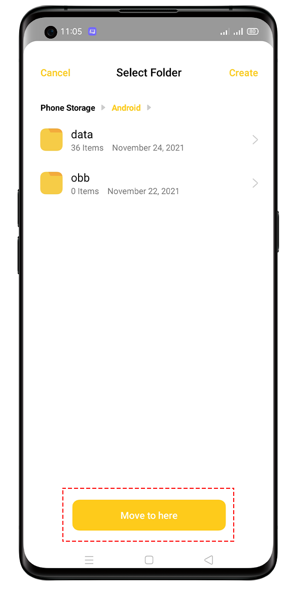 Tap [Phone storage] or to a folder where you want to move it, then tap a folder under it and tap [Move to here].