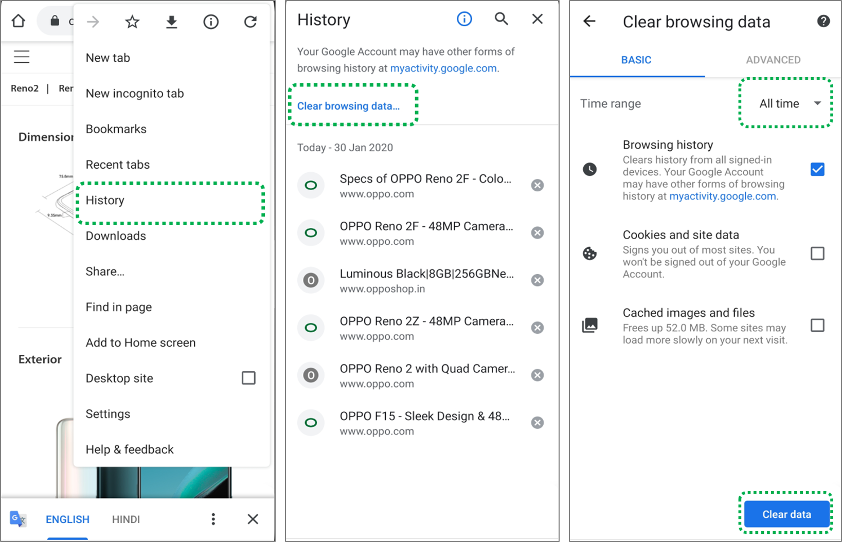 Open [Chrome] > Tap [] > [History] > [Clear Browsing Data] > [Basic] > Choose [Time Range] > Select [Browsing history] > [Clear Data].