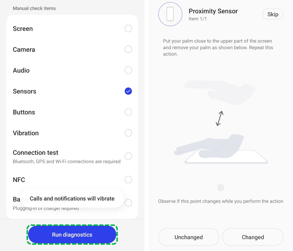 ] > [Diagnostics] > Select [Sensors] > [Run Diagnostics] > For proximity sensor, place your palm close to the upper half of the screen and then remove it and check if there are any changes to the point while acting. If the result for the proximity Sensor shows Error/ Unable to detect the problem, Kindly take your phone, and invoice to your nearby service center. Click here to locate the nearby service center.