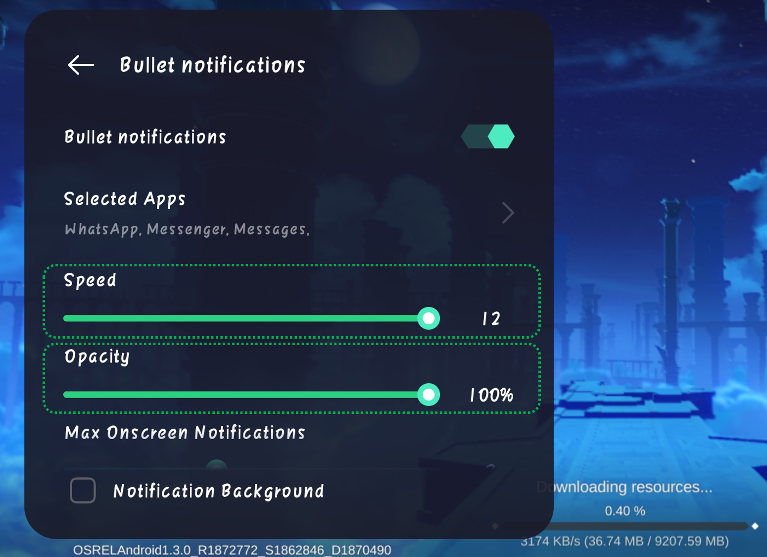 Adjust the slider to change the speed, opacity, and the maximum number of notifications received at the same time.