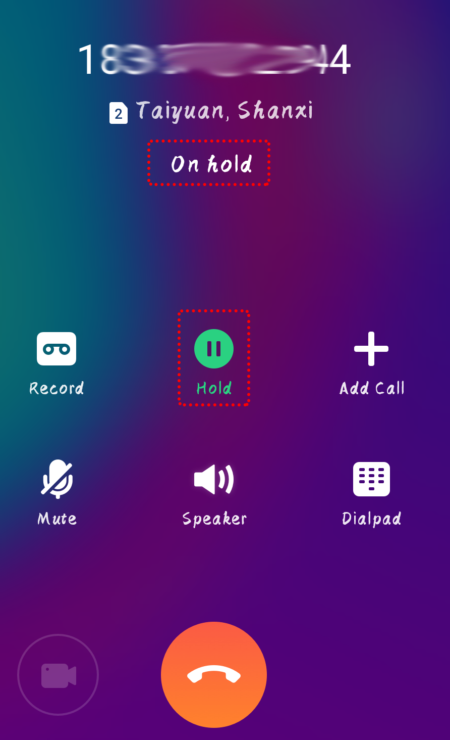 . The hold button turns green with the 'On hold' message displayed when a call is on hold.