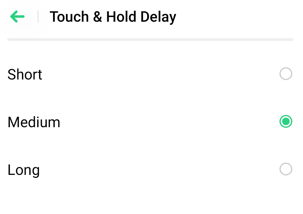 For ColorOS 12 to and above: Go to [Settings] > [Additional Settings] > [Accessibility] > [Interaction] > [Touch & delay] / [Touch and hold delay] > choose from [Short], [Medium], and [Long].