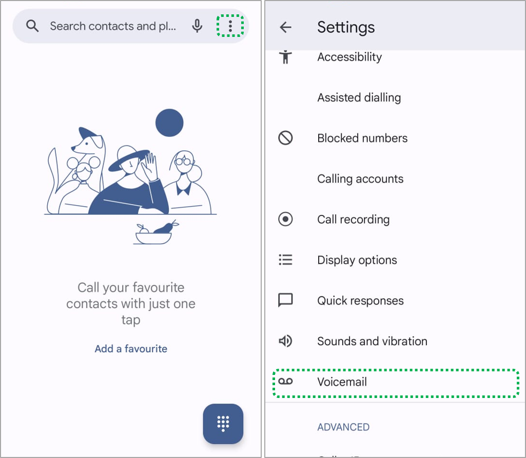 Go to [Phone App] > [3 dots] > [Settings] > [Voicemail] > [Select desired option (Service/Number)].