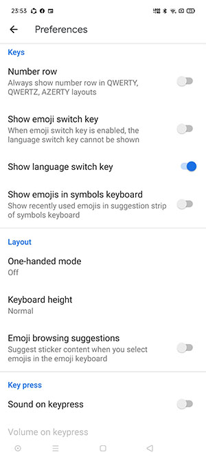 Keys: You can set Number row, Show emoji switch key, Show language switch key, and Show emojis in symbols keyboard.