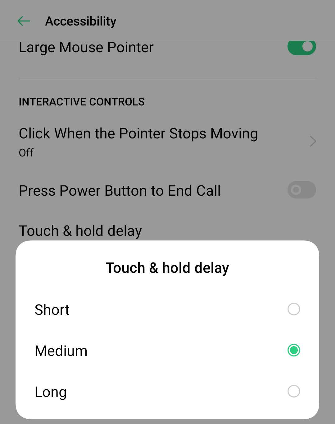 Go to [Settings] > [Additional Settings] > [Accessibility] and turn on [Touch & hold delay]. Then, you can select between Short, Medium, or Long.