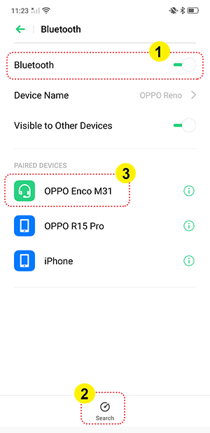 2. On your phone, turn on Bluetooth in [Settings] > [Bluetooth], tap [Search] and select [OPPO Enco M31] to connect. (The settings path to Bluetooth may vary depending on the phone brand.)