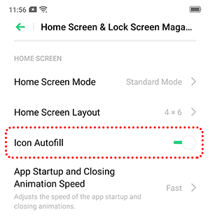 The Icon Autofill option automatically rearranges icons to fill the screen from top to bottom. To enable it, go to [Settings] > [Home Screen & Lock Screen Magazine] and toggle on [Icon Autofill].