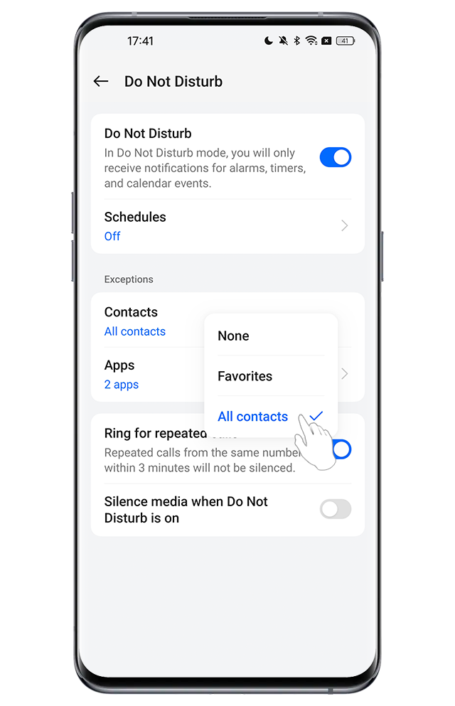 In some OPPO phones: Go to [Settings] > [Sounds & Vibration] > [Do Not Disturb]. Under Exceptions, tap [People] and select [Contacts]. Then, under Exceptions, tap [Apps] and enable [Phone] and [Phone calls] for app exception.