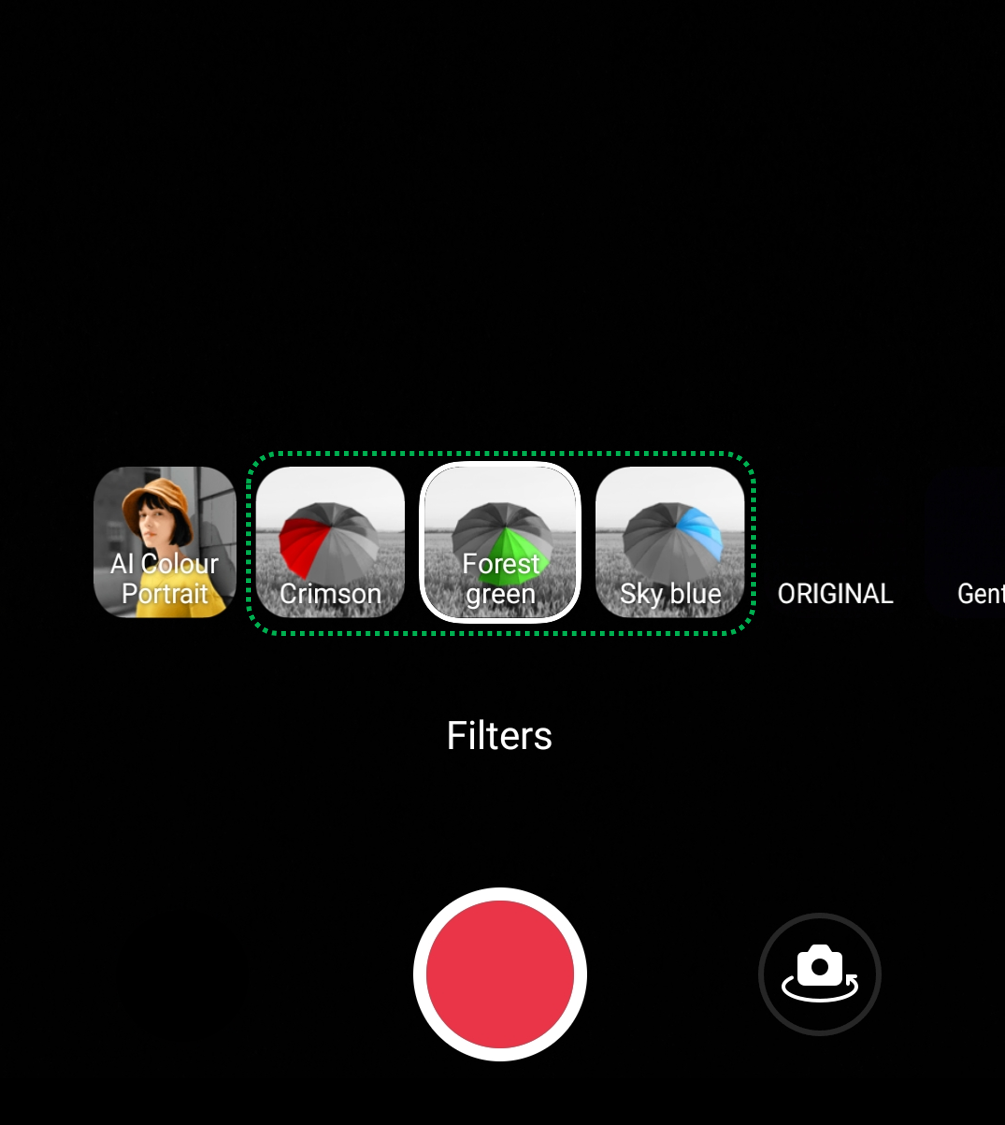 Open [Camera] > [Videos] > [] > Select Monochrome filters i.e. Crimson, Forest Green, and Sky Blue> [Record].
