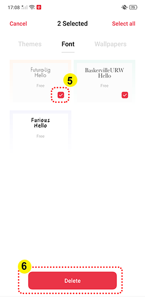5. Select the fonts you want to remove and tap [Delete] at the bottom. You can also remove all fonts by tapping [Select all].