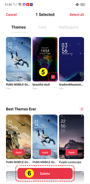 5. Select the themes you want to remove and tap [Delete] at the bottom. You can also remove all fonts by tapping [Select all].
