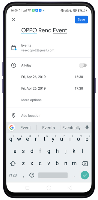To add an event, tap Calendar on the Home Screen, tap , pick a date and a time, then write down the name of the event, tap Save once done.