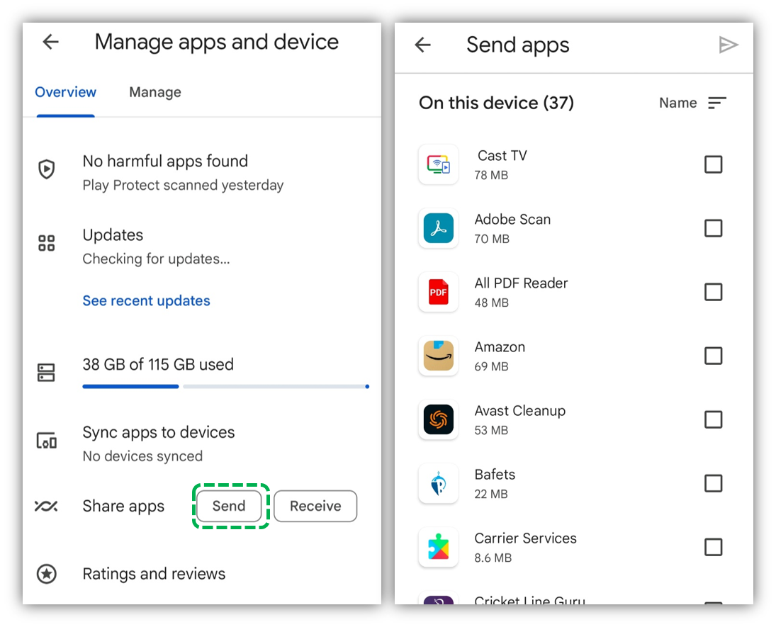 To share apps through the Google Play Store, the devices be running ColorOS 6.0 and above or Android 10 with the latest Google Play Store version. Click this link to learn how to update the Google Play Store. Once updated, follow the below steps: