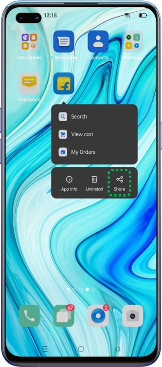 On your Home screen, tap and hold the app until you see the quick actions. Then tap [Share] and select the sharing method.