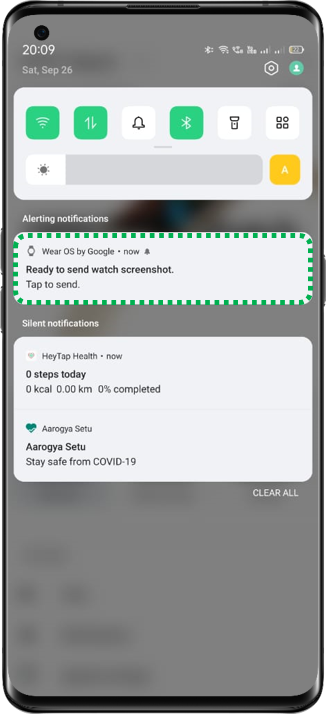 Make sure that your OPPO Watch is connected to your phone. Then, Open [WearOS] > Tap [] > [Take Screenshots of Watch] > Swipe down the notification panel > Tap on the [Tap to Send] > Select the [App] to share the photo.