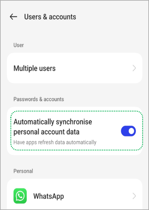 The syncing part of Android is also simplistic in a way. Just add the account, turn on Auto Sync, and you are done. The "Auto Sync" feature can be changed from [Settings] > [Accounts and Sync]. That setting basically means that it will sync your device with the service's servers.For ColorOS12.1 and above: Go to [Settings] > Click on [Account & Sync]/[Users & accounts] > Enable [Automatically synchronize personal account data] > Click on [Google] > Select [Account] > then tap the [Three-dotted] icon at the upper right and tap [Sync now].
