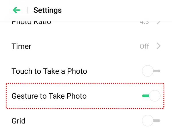 2. On the top right corner, tap the Settings icon and toggle on Gesture to Take Photo.