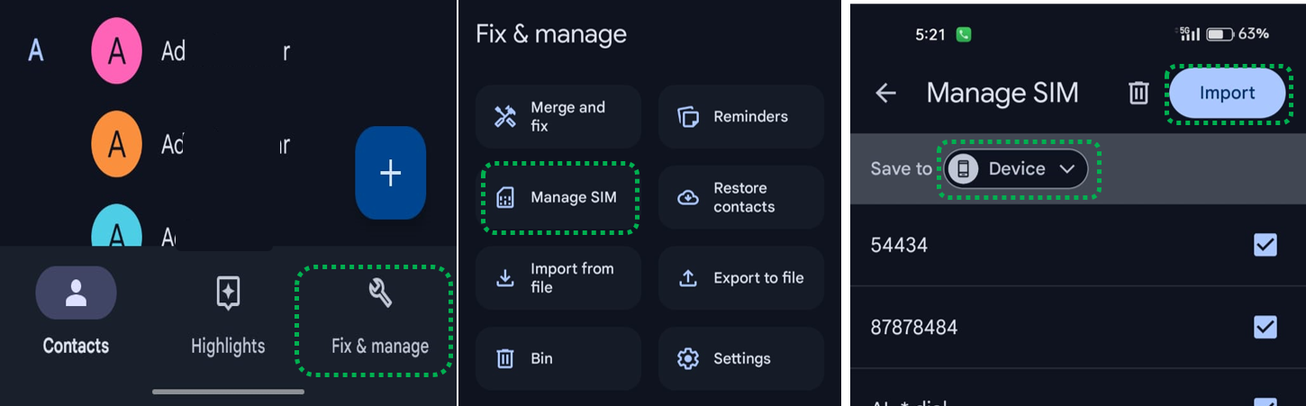 Open [Contacts] > Tap [Fix & manage] > [Import from SIM] > [Select the contacts to be imported] > Tap [Import]. You can also choose if you want to remove the copies of contacts.