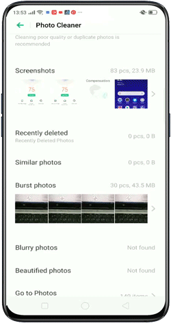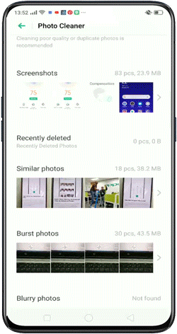 The Photo Cleaner in your phone intelligently picks out screenshots, similar, burst, beautified and blurry photos, so you can quickly delete them all in no time.