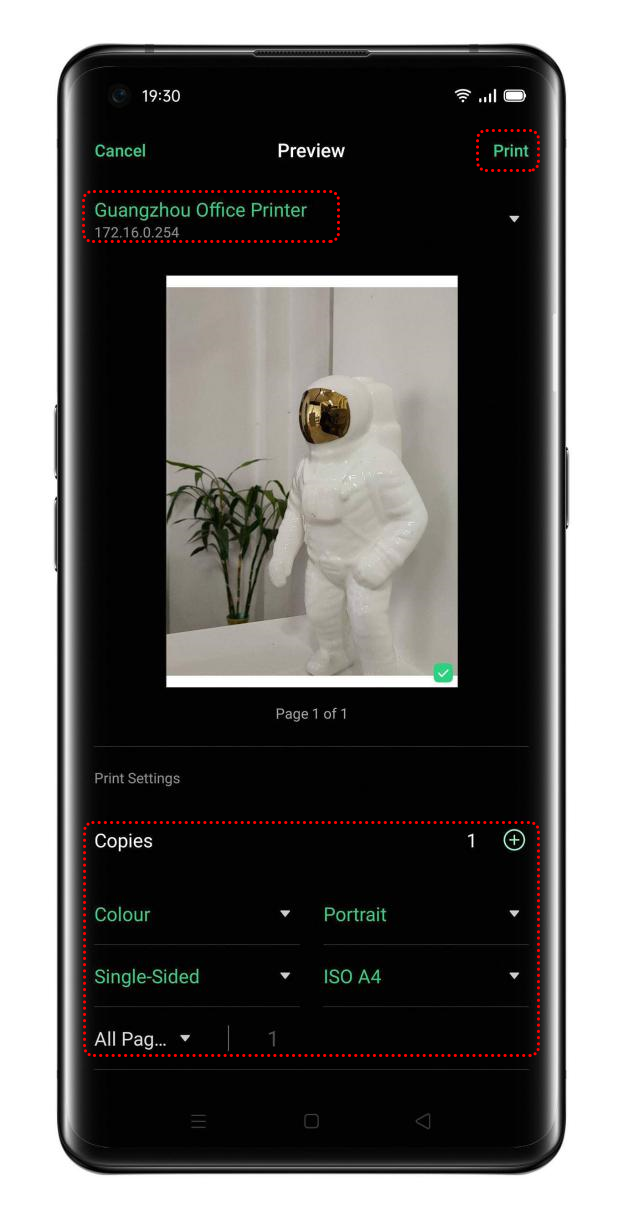3. Select a printer and connect to it, and then select print settings. You can customize printing parameters, color, number of copies, double-sided printing, paper size, page range, direction, etc.