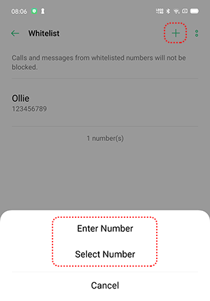 Tap the add icon on the top, and choose one of the options to whitelist. You can enter number manually or select numbers from contacts.