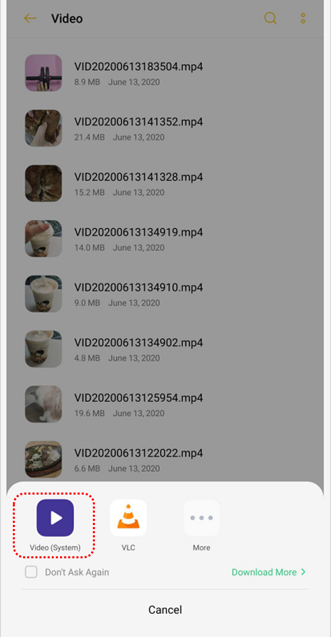 * In some devices, you may need to go to [Settings] > [Additional Settings] > [App management] > [All]. Go to [Files] > [Videos], select one and play it with the video player as you need.