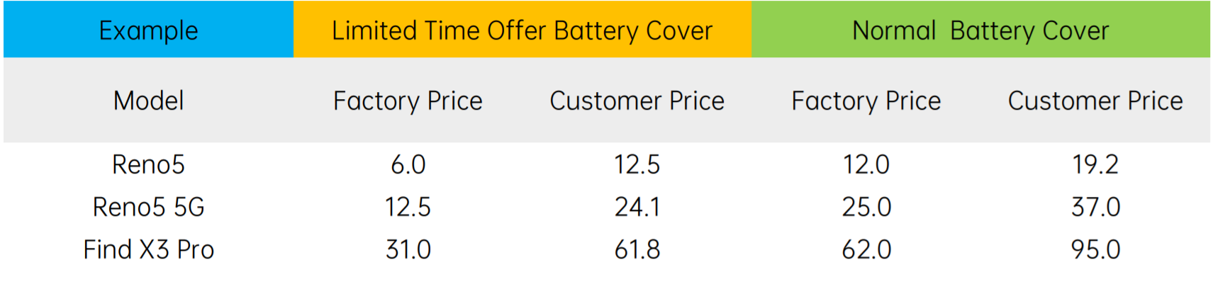Reduce the amount of customers who give up battery cover repairs, and reduce the cost of maintenance out of warranty. Attract price-sensitive users to repair to increase the maintenance volume.