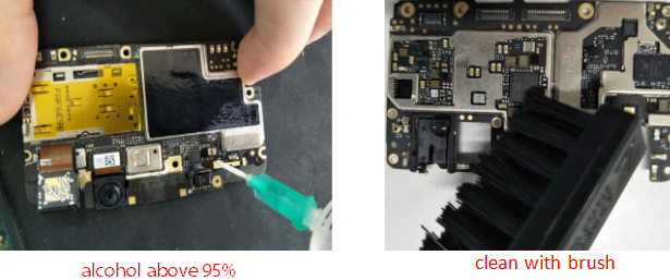 Overall cleaning refers to use above 95% concentration alcohol to clean oxidation, mold and liquid in motherboard/antenna plate/camera/speaker/BTB/ both sides of FPC.