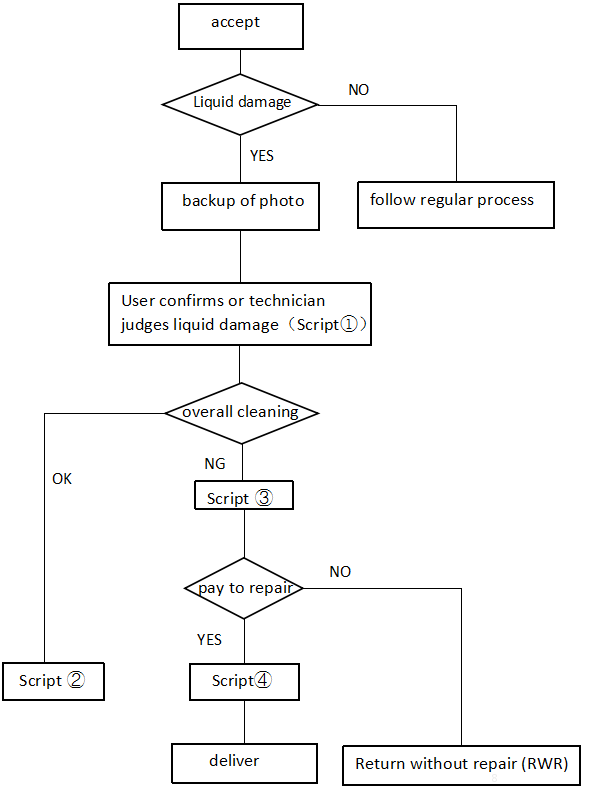 Through customer complaint data analysis,satisfaction degree of service center dealing with liquid damage device is too low,such as questioned judgment,not informed the risk of liquid damage,and without overall cleaning and test.
