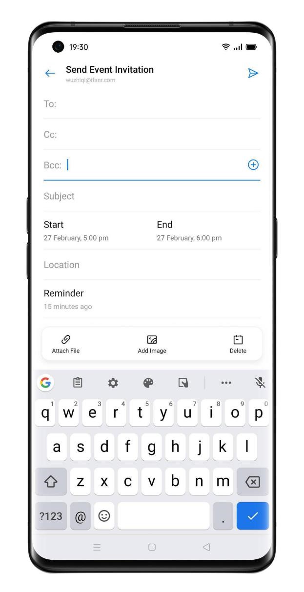 Tap the Add event button in the bottom right corner of the email composing screen to send a meeting invitation. Events will be seamlessly synced with your Google calendar account to streamline your workflow.