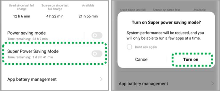 By default, you will be reminded by a pop-up window to enable super power-saving mode when the battery reaches 10% and 5%. If you want to enable super power-saving mode manually, follow the steps below: