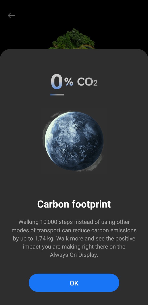 ColorOS 14 introduces the Go Green Always-On Display to raise awareness about climate change and environmental protection. The Go Green AOD includes three sets of Environment Vision pages, where each set includes five environment-related animations that can change based on the user's daily step count, showing the reduced carbon dioxide emissions from walking instead of taking other forms of transport. In this article, we will learn how the Carbon footprint option works in the Always on Display feature.