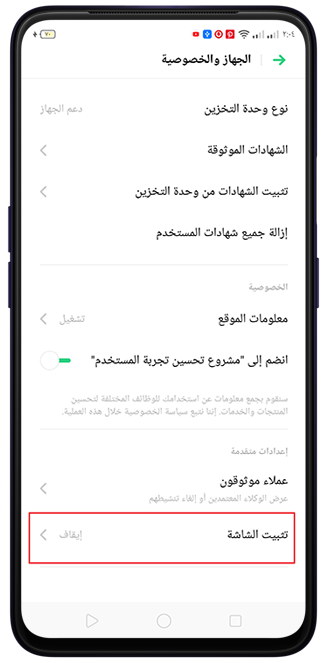 للأجهزة العاملة بواجهة تشغيل Color OS 3.2، اذهب ل[الإعدادات] > [إعدادات إضافية] > [الأمان والخصوصية] > [تثبيت الشاشة] وفعل [تثبيت الشاشة].