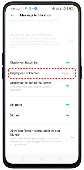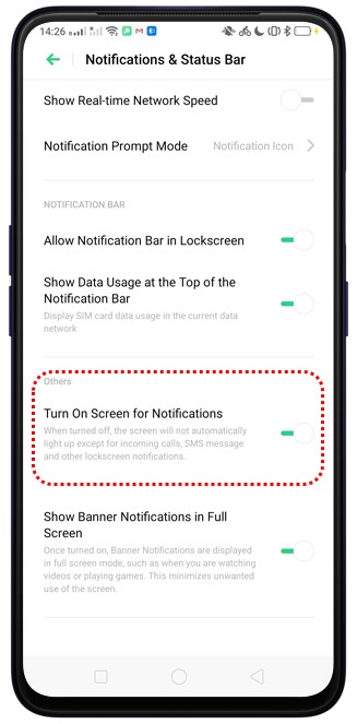 Ve a [Ajustes] > [Barra de estado y notificaciones] y toca [Encender pant. para rec. notificaciones], luego la pantalla se encenderá cada vez que recibas una notificación de mensaje.. Cuando esta función está desactivada, la pantalla no se encenderá, excepto para las llamadas entrantes y los mensajes SMS.