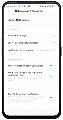 Para permitir que tus aplicaciones muestren notificaciones en la pantalla de bloqueo, ve a [Ajustes] > [Barra de estado y notificaciones] > [Administrar notificaciones], selecciona una aplicacióny toca [Mostrar en pantala de bloqueo] para habilitar.