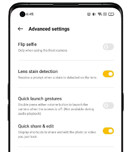 ជាមួយនឹង ColorOS 11 មានមុខងារដ៏អស្ចារ្យមួយចំនួនដែលត្រូវបានបន្ថែមទៅក្នុងកម្មវិធីប្រព័ន្ធកាមេរ៉ា។ ឥឡូវនេះ អ្នកនឹងទទួលបានការជូនដំណឹង ប្រសិនបើកញ្ចក់កាមេរ៉ារបស់អ្នកមានស្នាមប្រឡាក់ ឬអ័ព្ទ។ ឥឡូវនេះ កាមេរ៉ាអាចបើកដំណើរការបានយ៉ាងលឿនដោយចុចពីរដងលើប៊ូតុងកម្រិតសម្លេង នៅពេលដែលអេក្រង់បិទ។ អ្នកក៏អាចចែករំលែក និងកែសម្រួលរូបថតរបស់អ្នកដោយផ្ទាល់ពីចំណុចប្រទាក់កាមេរ៉ាដោយអូសឡើងលើរូបតំណាងមើលរូបថតជាមុននៅជ្រុងខាងក្រោមខាងឆ្វេង។ សូមអានបន្ត ដើម្បីដឹងបន្ថែមអំពីការកំណត់កាមេរ៉ាកម្រិតខ្ពស់នៅលើ ColorOS 11។