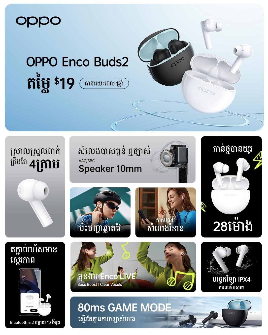 សំឡេងបាសធ្ងន់ លឺច្បាស់ AAC/SBC SPEAKER 10mm កាន់ថ្មបានយូរ 28 ម៉ោង។ តភ្ជាប់រហ័ស OPPO Flash Connect មានស្ថេរភាព Bluetooth 5.2 ចម្ងាយ 10 ម៉ែត្រប៉ះបញ្ជាឆ្លាតវៃ និងបច្ចេកវិទ្យា IPX4 ការពារទឹកសាច។